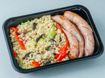 Bulgur cu legume sotate și cârnăcior de pui